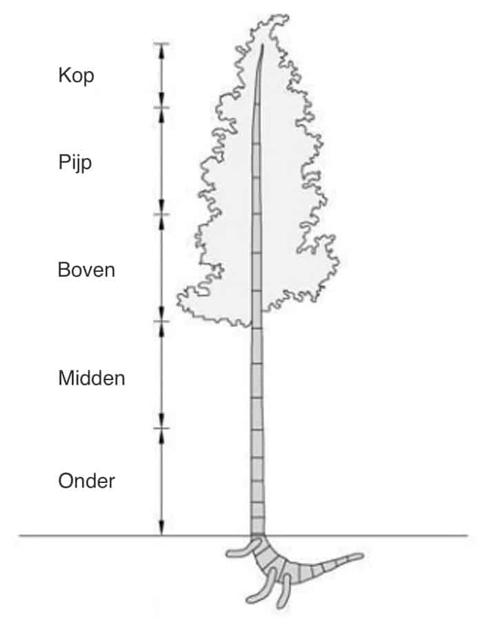 Each sample should contain a knot because the direction of the knot's grain is opposite to the direction of the stem's grain. Therefore, the knot is considered to be the weakest point under tensile loading (for compressive strength testing, it is the other way around). The moisture content of each of these test specimens should also be determined according to the ISO 22157 standard.