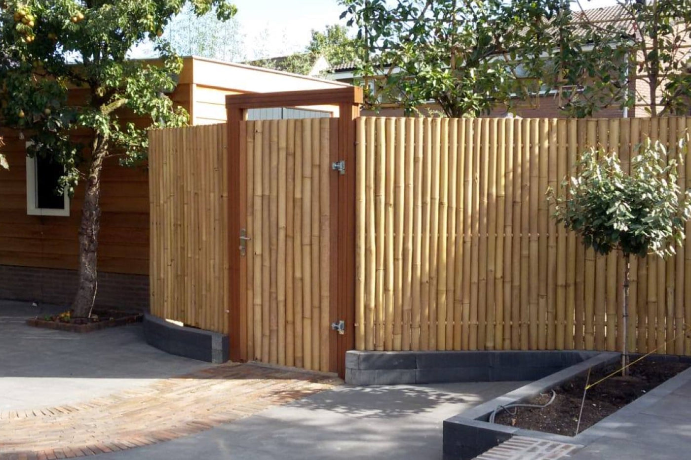 Les clôtures qui s'harmonisent parfaitement avec les portes de portail en bambou sont : la Clôture en Bambou Géant Foncé et la Clôture en Bambou Géant Naturel.